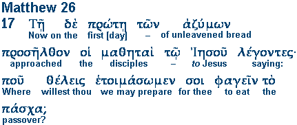 Now on the first [day] of unleavened bread... (Matthew 26:17).Here is the Greek for those two verses, with the direct translations into English: