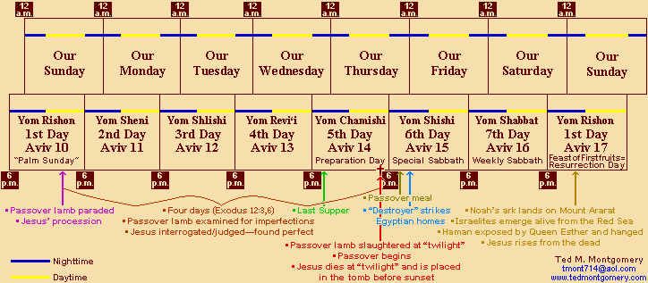 My Holy Week chart, near the bottom of this page, displays my depiction of the week during which the following occurred in the month of Aviv (also called Nisan) of that year: