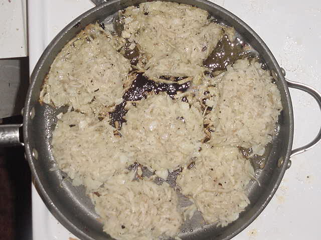 Heat ¼ inch olive oil in a large skillet over medium to medium-high heat. Drop ¼-cup globs of the potato-onion mixture into the oil, press each one flat with a pancake turner, and fry each side 7-10 minutes until brown on each side. Lift up one edge the latkes with the pancake turner to check how brown they are underneath. Be careful not to burn a side.