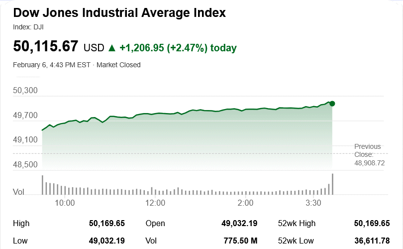 Today, for the first time ever, the Dow Jones Industrial Average closed higher than 50,000 points. During the trading hours, it rose 1,206.95 points (2.47%) from yesterday’s market closure and closed today at 50,115.67. The Dow’s record intraday high still remains at 50,169.65.