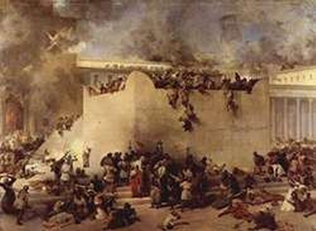 The First Temple was built by King Solomon and was the most important place in ancient Judaism. It was destroyed when the Babylonians sacked Jerusalem in 586 B.C.E. The Second Temple was built on the site of the First Temple and was completed in 516 B.C.E. Sadly, the Second Temple was also destroyed, this time during the Roman siege of Jerusalem in 70 C.E. The destruction of the two Temples took place on the same day — the ninth of Av — about 656 years apart. These two events were so tragic that the ancient rabbis declared the anniversary of the Temples' destruction a day of mourning. This is the origin of Tisha B'Av.
