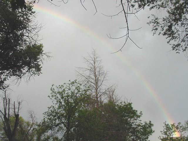 I saw a really cool rainbow this afternoon. It wasn’t even visible for very long. Fortunately, my camera was nearby. It actually was a full, complete rainbow, although I was unable to get far enough away from it to capture all of it at once.