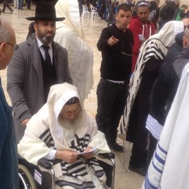 ![]() The mystical sage Rabbi Amram Vaknin with his student Gil Nachman, praying for the Messiahat the Western Wall, April 1, 2015. (Photo:Yehudis Schamroth) |