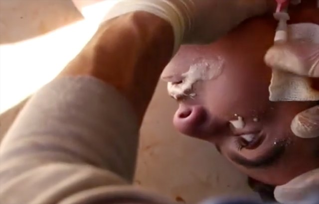 The videos, shared by activists and residents, showed children and older people gasping and struggling to breathe. Here, a child is treated in the town of Khan Sheikhoun.