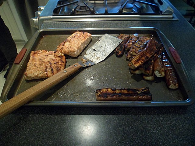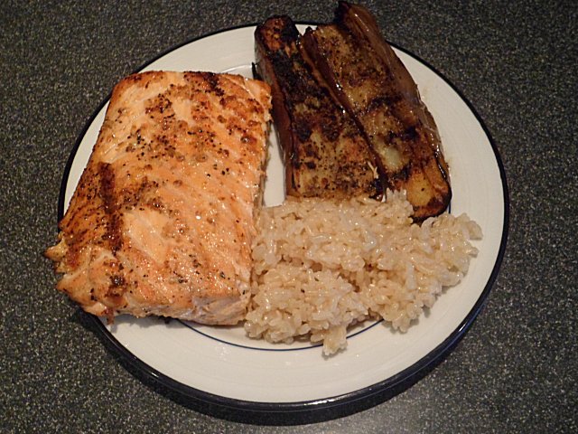 Everything was outstanding, as he is a great cook. Salmon is one of my most favorite foods, and grilled eggplant is way up there. Best of all, there was enough to have leftovers.