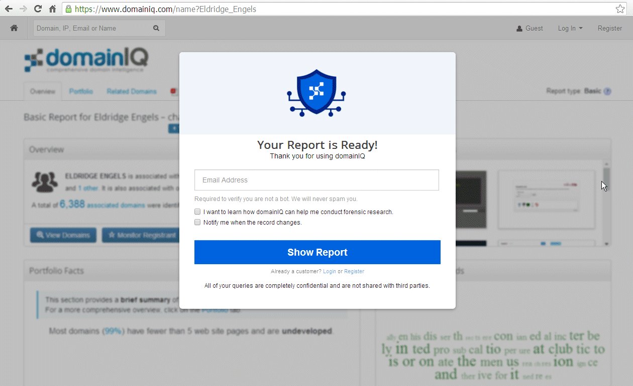 Next, I did a search for Eldridge Engels and then clicked on the https://www.domainiq.com/name?Eldridge_Engels link on the browser page. Although a page came up, a big square appeared preventing me from seeing all the information on the page.