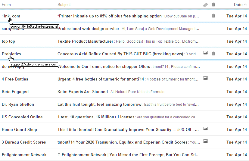 I took a screen shot of my mouse pointer just underneath two of the “From” entries. They revealed these two email addresses: