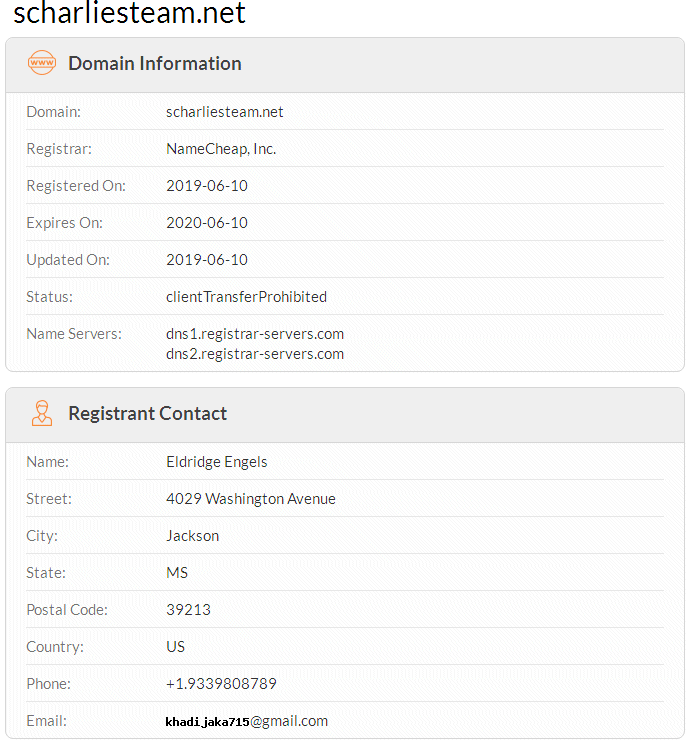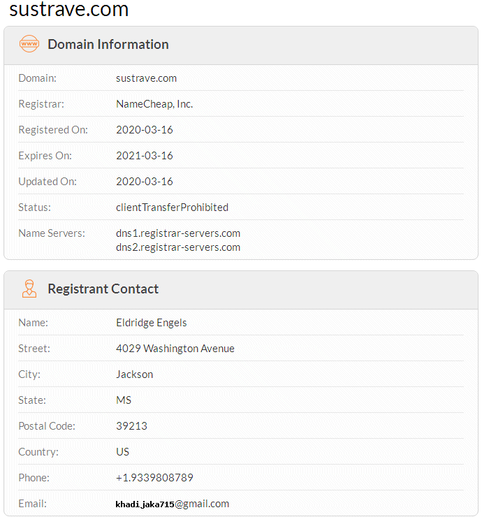 Therefore, I clicked on the “Whois” button to the right of each domain name. In both cases, it was shown that the domain names (scharliesteam.net and sustrave.com) belong to Eldridge Engels, 4029 Washington Avenue, Jackson, MS. Furthermore, the contact email address for both domains is khadijake715@gmail.com: