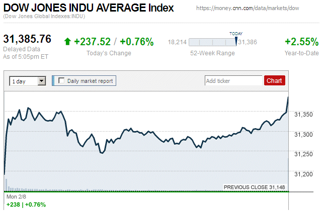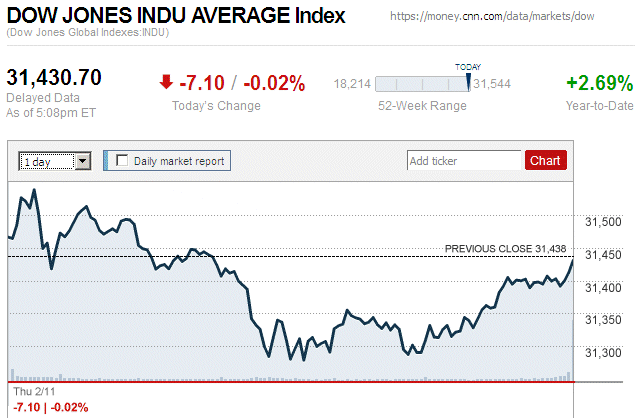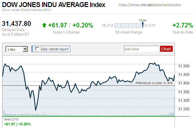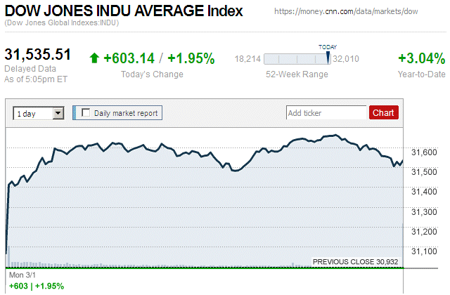 After a few days of widespread sizeable declines of major stock indices, there was a large and significant upswing today. The Dow Jones Industrial Average (DJIA) was up 1.85% to 31,496.30, while the Standard & Poor’s 500 stock index was up 1.95% to 3,841.94. The NASDAQ Composite index was up 1.55% to 12,920.15. ![]() |