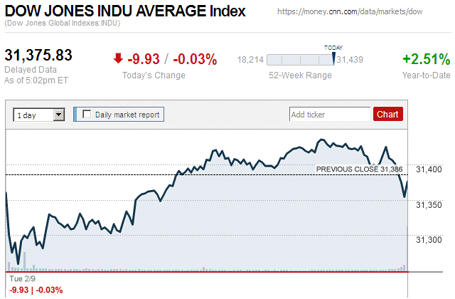 Like yesterday, the Dow was up, while the S&P 500 and NASDAQ were down. The Dow Jones Industrial Average (DJIA) was up 0.29% to 31,613.02, a record high close (the first close over 31,600), with a record intraday high of 31,643.70; while the Standard & Poor’s 500 stock index was down 0.03% to 3,931.33. The NASDAQ Composite index was down 0.58% to 13,965.50. ![]() |