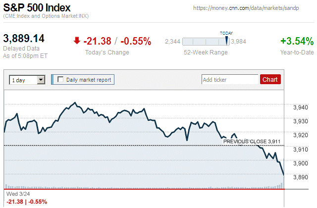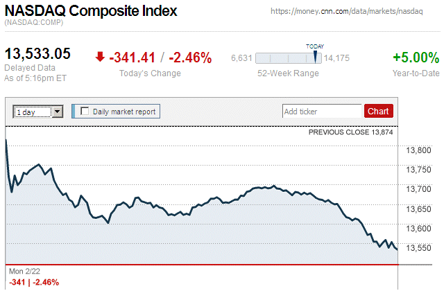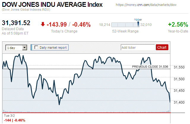 Compared to yesterday’s moderate increases in major stock indices, today they went the opposite direction and were down by large amounts. The Dow Jones Industrial Average (DJIA) was down 1.75% to 31,402.01, while the Standard & Poor’s 500 stock index was down 2.45% to 3,829.34. The NASDAQ Composite index was down 3.52% to 13,119.43. ![]() |
