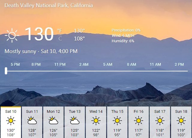 Last night at 8:30 p.m., the temperature in Death Valley was still 120°, and the temperature during the night was not expected to go lower than 108°. Today, the high temperature may miss the 130° level by only a couple of degrees.