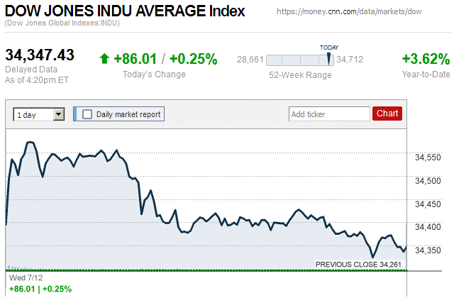 After “zigging” and “zagging” between negative and positive territories during the trading day, major stock indices closed with tiny to very small gains. The Dow Jones Industrial Average (DJIA) was up 0.02% to 34,624.30, while the Standard & Poor’s 500 stock index was up 0.07% to 4,453.53. The NASDAQ Composite index was up 0.01% to 13,710.24. ![]() |