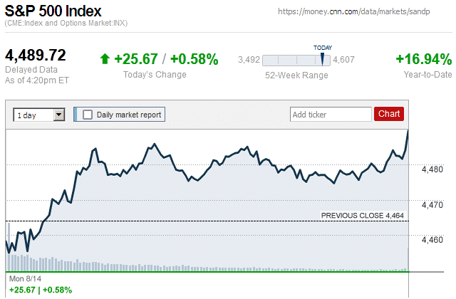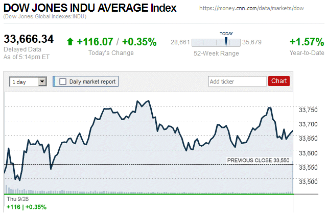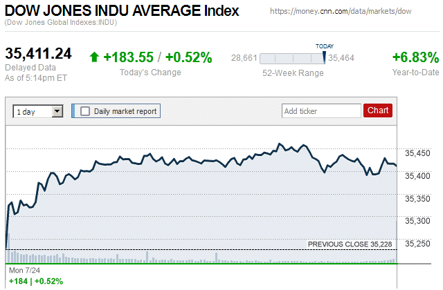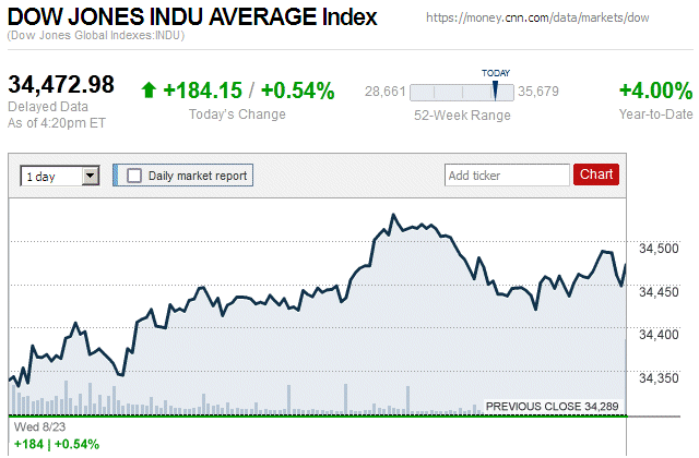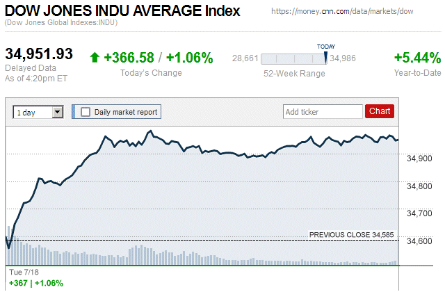 Although major stock indice began the trading day in negative territory, they closed with small to moderate gains. The Dow Jones Industrial Average (DJIA) was up 0.07% to 35,307.63, while the Standard & Poor’s 500 stock index was up 0.58% to 4,489.72. The NASDAQ Composite index was up 1.05% to 13,788.33. ![]() |