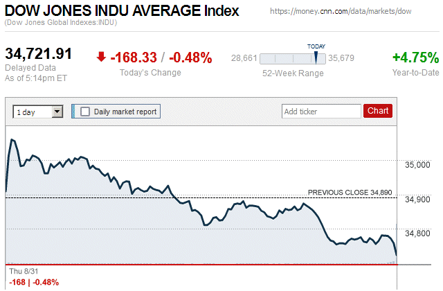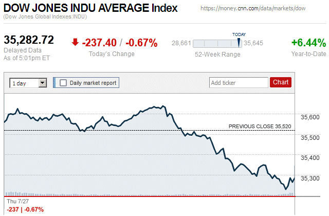 After yesterday’s widespread market plunge, there also were declines today with major stock indices closing with very small to small losses. The Dow Jones Industrial Average (DJIA) was down 0.19% to 35,215.89, while the Standard & Poor’s 500 stock index was down 0.25% to 4,501.89. The NASDAQ Composite index was down 0.10% to 13,959.72. ![]() |