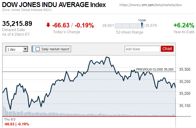 After two days of market declines, major stock indices closed today with tiny to small gains. The Dow Jones Industrial Average (DJIA) was up 0.15% to 35,176.15, while the Standard & Poor’s 500 stock index was up 0.03% to 4,468.83. The NASDAQ Composite index was up 0.12% to 13,737.99. ![]() |
