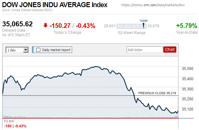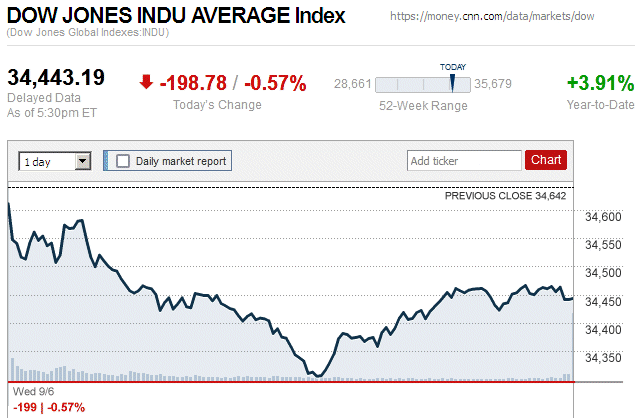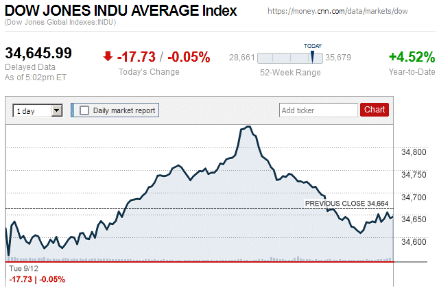 On the first trading day of widespread declines in almost two weeks, major stock indices closed with small to moderate losses. The Dow Jones Industrial Average (DJIA) was down 0.56% to 34,641.97, while the Standard & Poor’s 500 stock index was down 0.42% to 4,496.83. The NASDAQ Composite index was down 0.08% to 14,020.95. ![]() |