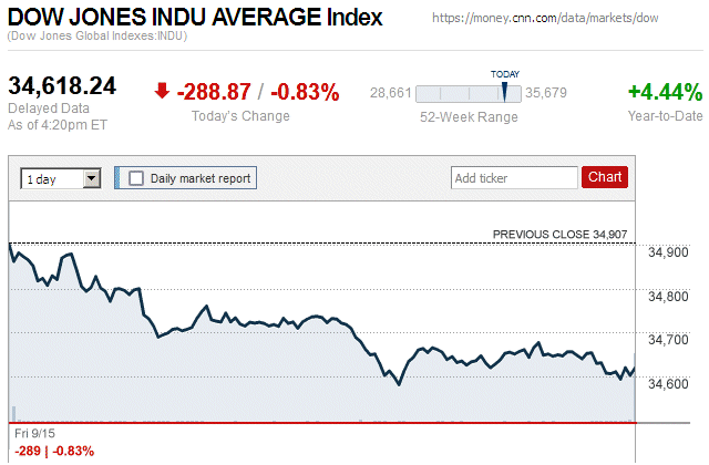 After significant “zigging” and “zagging” throughout the trading day, major stock indices closed with small to moderate losses. The Dow Jones Industrial Average (DJIA) was down 0.38% to 34,288.64, while the Standard & Poor’s 500 stock index was down 0.20% to 4,446.82. The NASDAQ Composite index was down 0.18% to 13,791.65. ![]() |