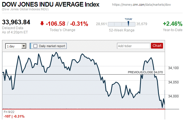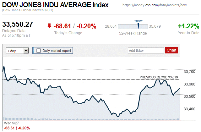In the third widespread market decline in a week, major stock indices closed the trading day with small to moderate losses. The Dow Jones Industrial Average (DJIA) was down 0.55% to 33,734.88, while the Standard & Poor’s 500 stock index was down 0.29% to 4,398.95. The NASDAQ Composite index was down 0.13% to 13,660.72. ![]() |
