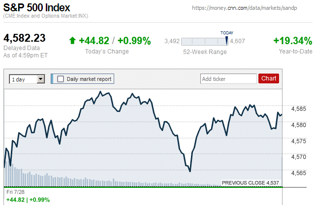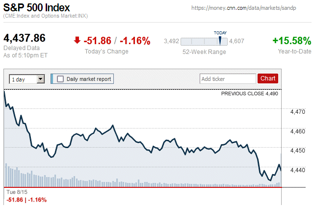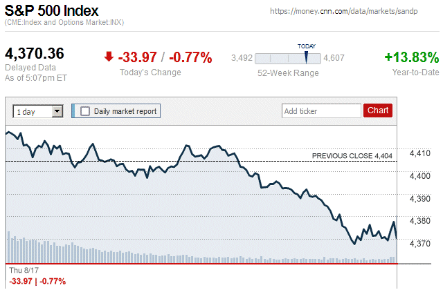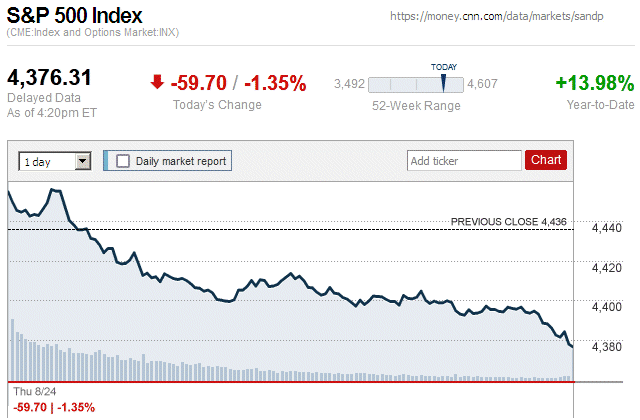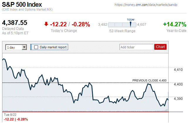 In a notable market sell-off today, major stock indices closed with moderate to large losses. Also, they were in negative territory for the entire trading day. It is likely that this sudden downturn was influenced by the downgrading of the credit rating of the U.S., from AAA to AA+, by the Fitch Ratings credit rating agency. ![]() |