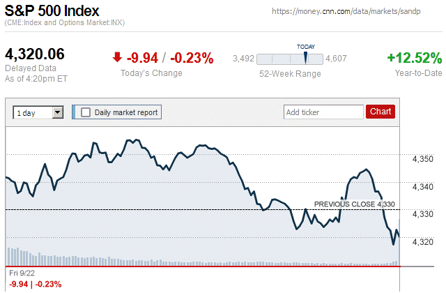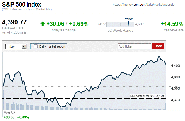 After three trading days of widespread losses, major stock indices closed today with tiny to small mixed amounts. The Dow Jones Industrial Average (DJIA) was up 0.07% to 34,500.66, while the Standard & Poor’s 500 stock index was down 0.01% to 4,369.71. The NASDAQ Composite index was down 0.20% to 13,290.78. ![]() |
