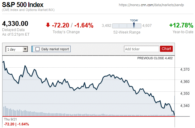 After steady declines through the trading day, major stock indices closed with moderate to large losses. The Dow Jones Industrial Average (DJIA) was down 1.08% to 34,099.42, while the Standard & Poor’s 500 stock index was down 1.35% to 4,376.31. The NASDAQ Composite index was down 1.87% to 13,463.97. ![]() |