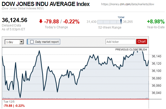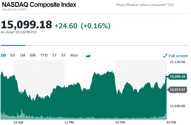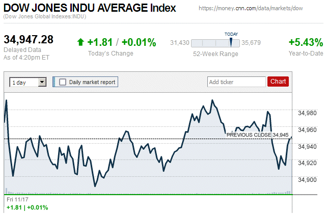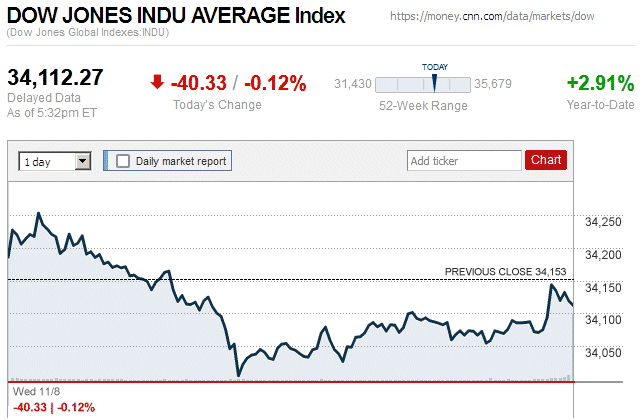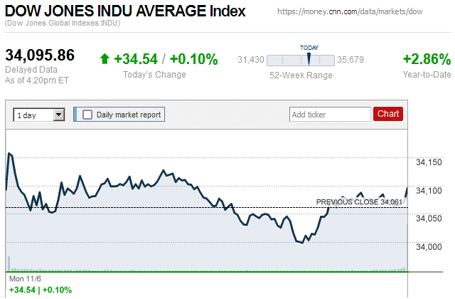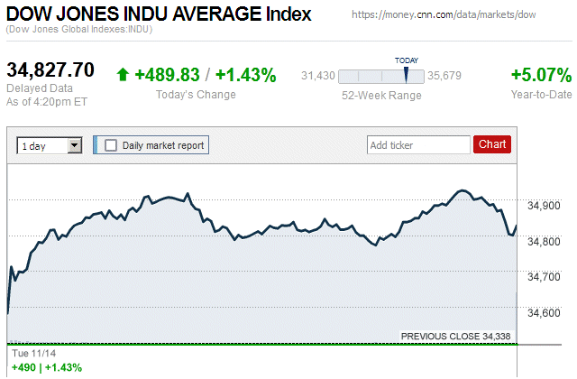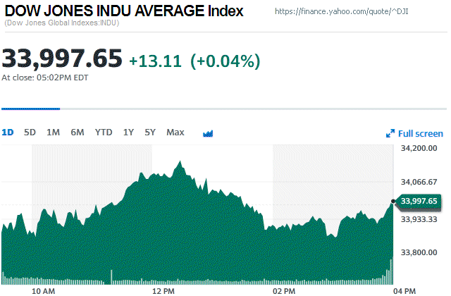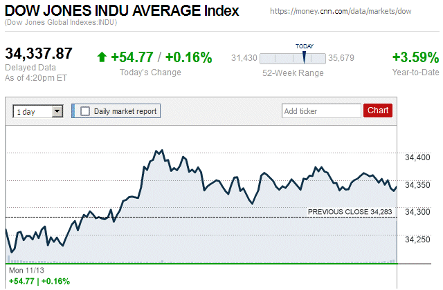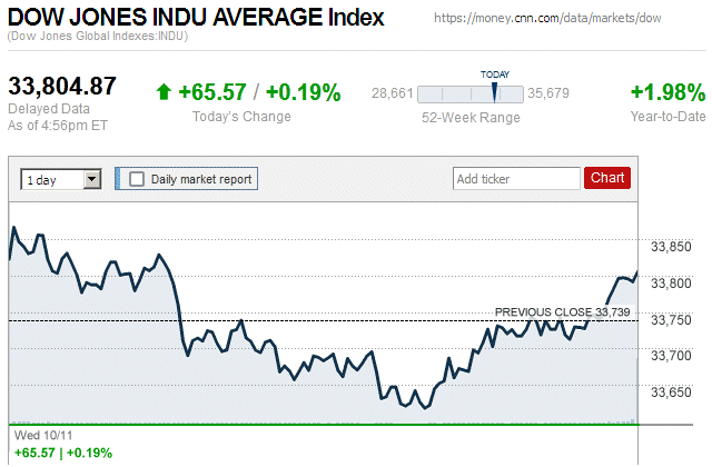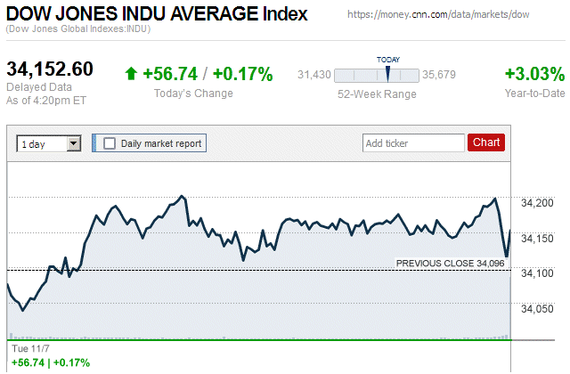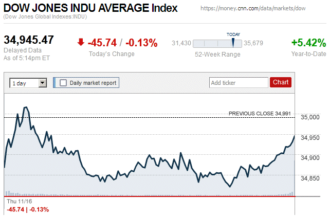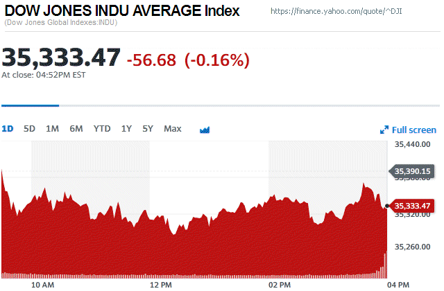 Following a great deal of “zigging” and “zagging” between positive and negative territories throughout the trading day, major stock indices closed with tiny to very small gains. The Dow Jones Industrial Average (DJIA) was up 0.01% to 34,947.28, while the Standard & Poor’s 500 stock index was up 0.13% to 4,514.02. The NASDAQ Composite index was up 0.08% to 14,125.48. ![]() ![]() ![]() |