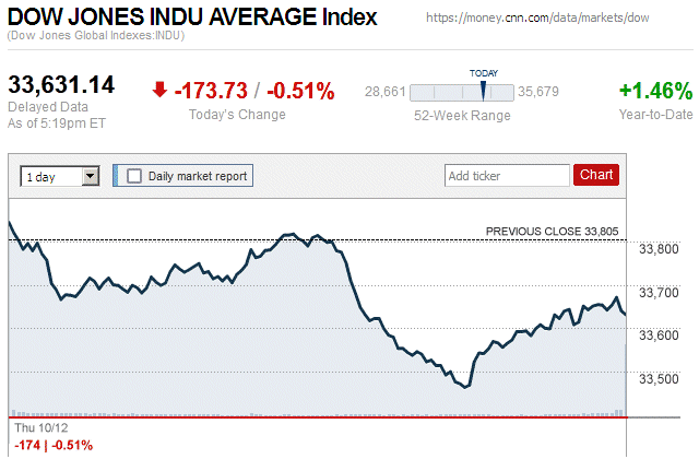 After four consecutive days of widespread market gains, major stock indices were down today and closed with small to moderate losses. The Dow Jones Industrial Average (DJIA) was down 0.51% to 33,631.14, while the Standard & Poor’s 500 stock index was down 0.62% to 4,349.61. The NASDAQ Composite index was down 0.63% to 13,574.22. ![]() ![]() ![]() |