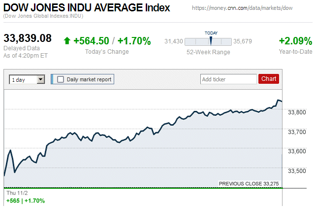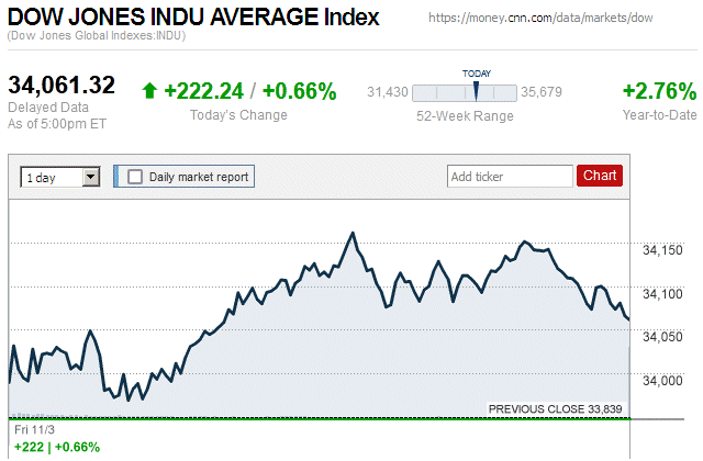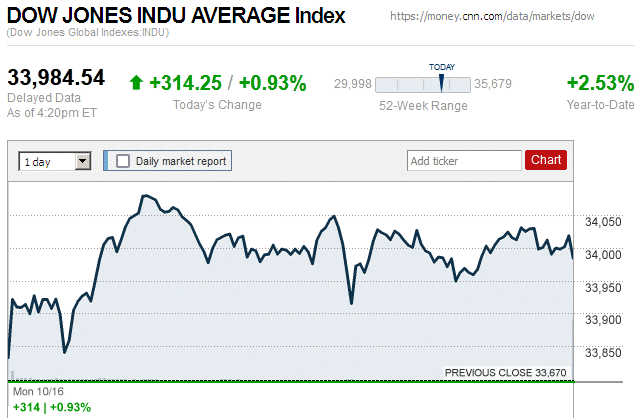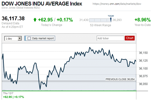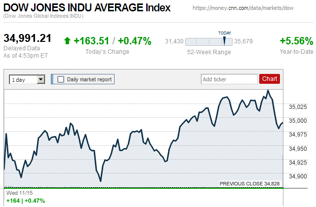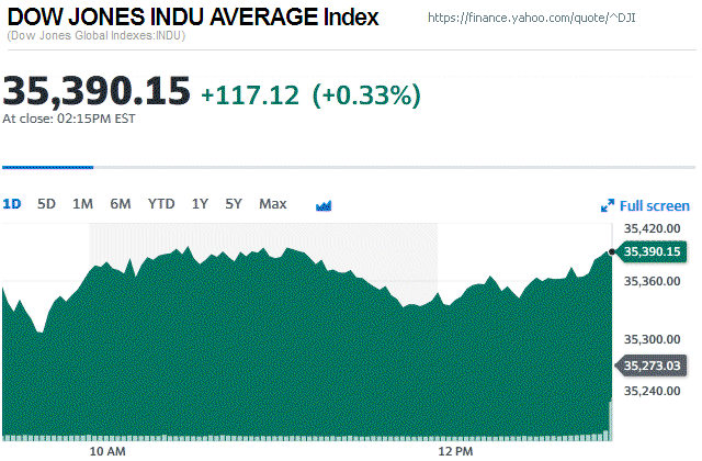 After “zigging” and “zagging” throughout the trading day, major stock indices closed with very small to moderate gains. The Dow Jones Industrial Average (DJIA) was up 0.47% to 34,991.21, while the Standard & Poor’s 500 stock index was up 0.16% to 4,502.88. The NASDAQ Composite index was up 0.07% to 14,103.84. ![]() ![]() ![]() |