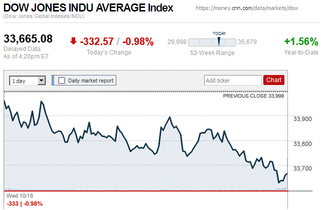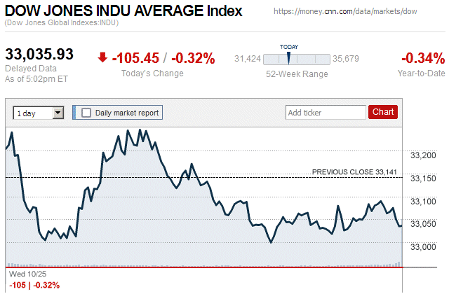 Although major stock indices began the trading day in positive territory, they “zigged” and “zagged” between positive and negative territories throughout the day and closed with moderate to large losses. The Dow Jones Industrial Average (DJIA) was down 0.75% to 33,414.17, while the Standard & Poor’s 500 stock index was down 0.85% to 4,278.00. The NASDAQ Composite index was down 0.96% to 13,186.18. ![]() ![]() ![]() |