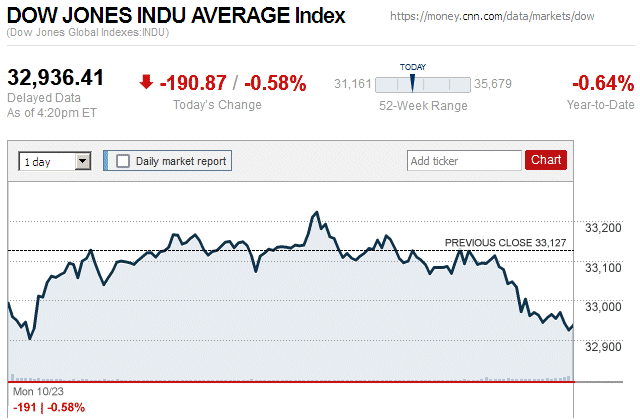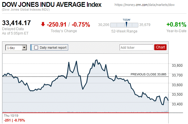After the first widespread declines in two weeks, major stock indices closed with moderate to large losses. The Dow Jones Industrial Average (DJIA) was down 0.65% to 33,891.94, while the Standard & Poor’s 500 stock index was down 0.81% to 4,347.35. The NASDAQ Composite index was down 0.94% to 13,521.45. ![]() ![]() ![]() |