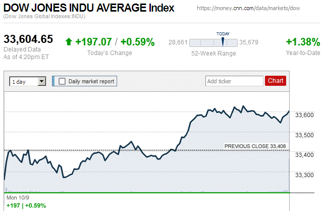 Although major stock indices began the trading day in positive territory, they declined into negative territory but then climbed back up and closed with small to moderate gains. The Dow Jones Industrial Average (DJIA) was up 0.19% to 33,804.87, while the Standard & Poor’s 500 stock index was up 0.43% to 4,376.95. The NASDAQ Composite index was up 0.71% to 13,659.68. ![]() ![]() ![]() |