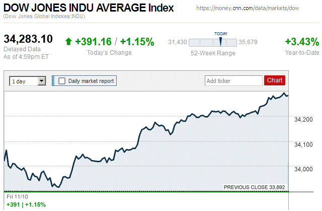 In the seventh widespread market rally in a row, major stock indices closed the trading day with small to moderate gains. The Dow Jones Industrial Average (DJIA) was up 0.17% to 34,152.60, while the Standard & Poor’s 500 stock index was up 0.28% to 4,378.38. The NASDAQ Composite index was up 0.90% to 13,639.86. ![]() ![]() ![]() |