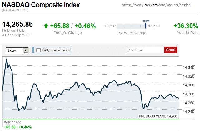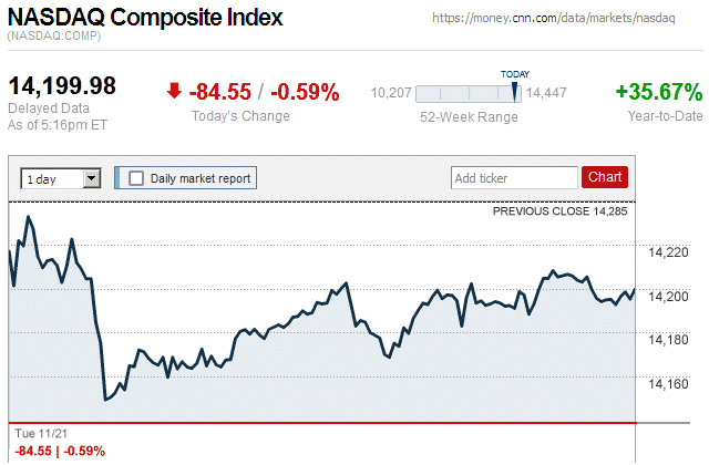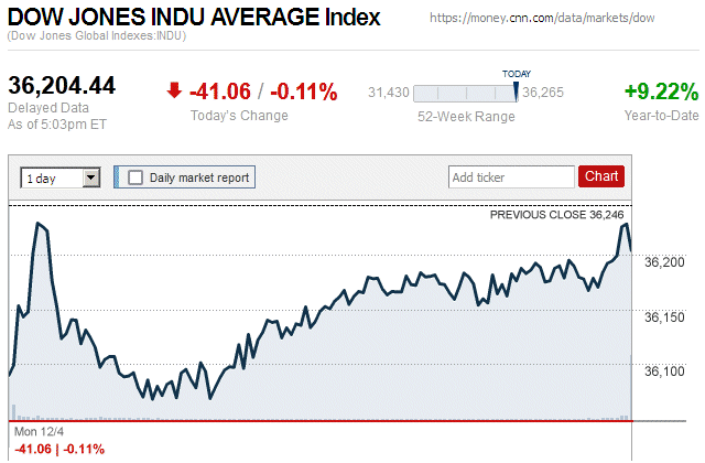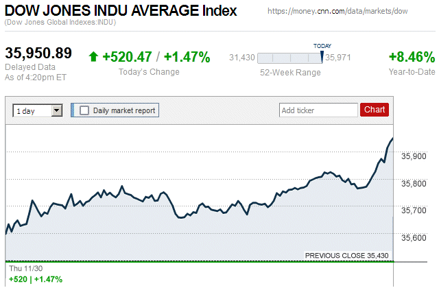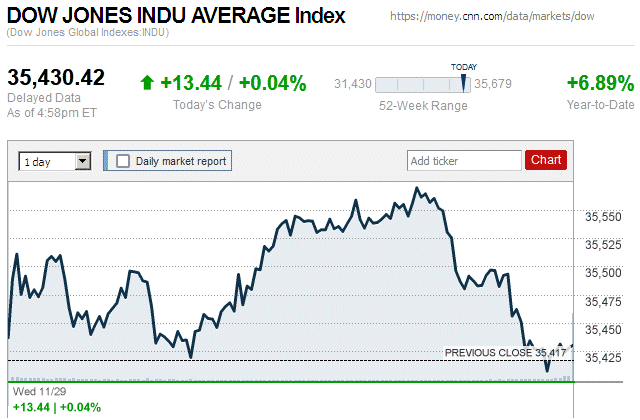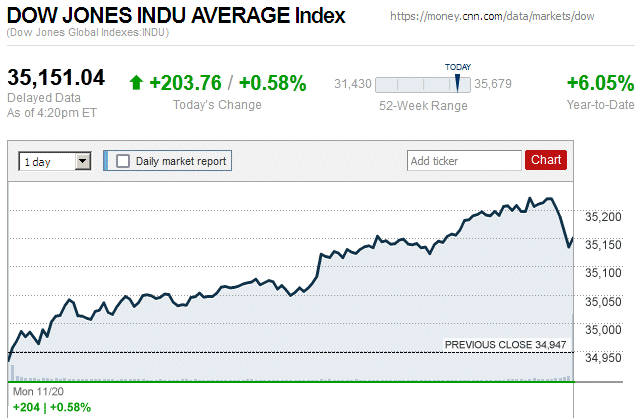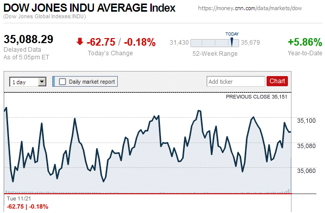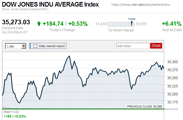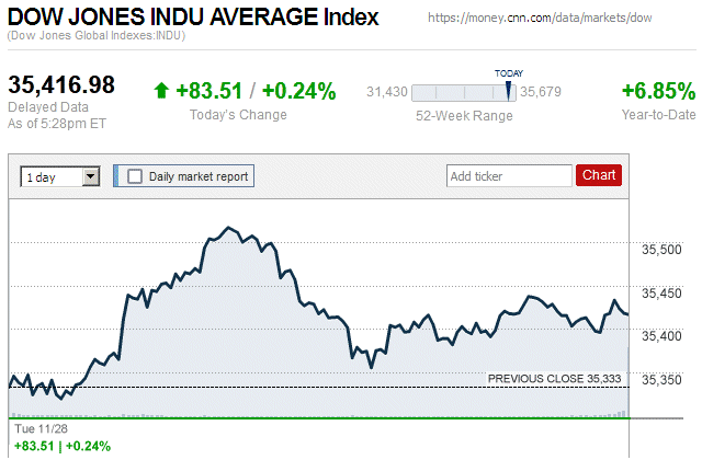 On an abbreviated Black Friday trading day, there were mixed movements of major stock indices by tiny to small amounts. The Dow Jones Industrial Average (DJIA) was up 0.33% to 35,390.15, while the Standard & Poor’s 500 stock index was down 0.06% to 4,559.34. The NASDAQ Composite index was down 0.11% to 14,250.85. ![]() ![]() ![]() |