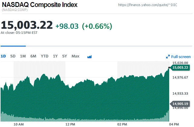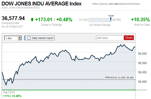 For the third trading day in a row, major stock indices closed today with small to moderate gains. The Dow Jones Industrial Average (DJIA) was up 0.48% to 36,577.94, while the Standard & Poor’s 500 stock index was up 0.46% to 4,643.70. The NASDAQ Composite index was up 0.70% to 14,533.40. ![]() ![]() ![]() |