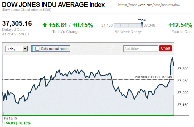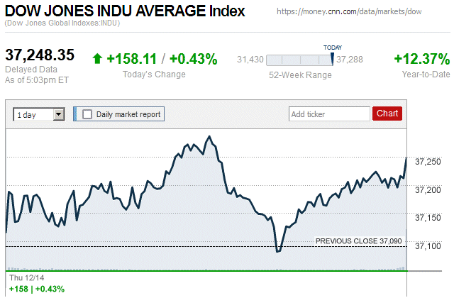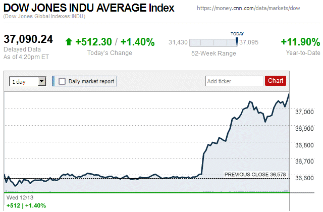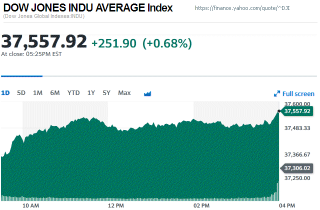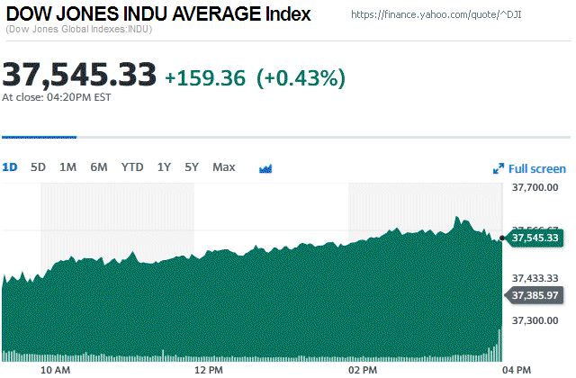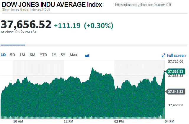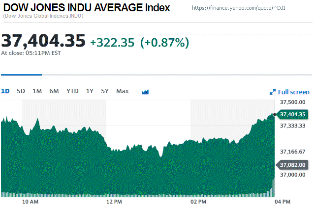 In a large market rally, major stock indices closed the trading day with moderate to very large gains. The Dow Jones Industrial Average (DJIA) surpassed it’s previous record high of 36,799.65 on Jan. 4, 2022. Also, it was the first time in history that the Dow closed above 37,000. ![]() ![]() ![]() |