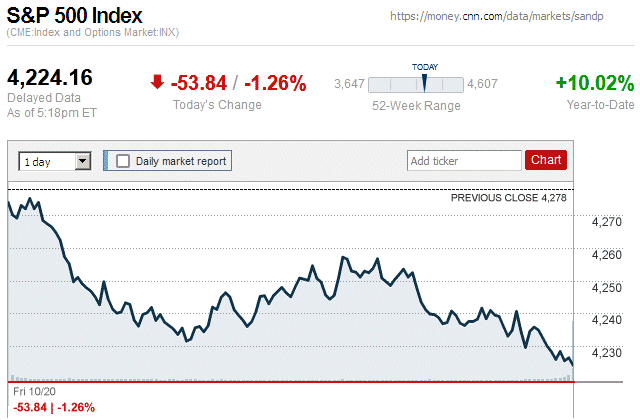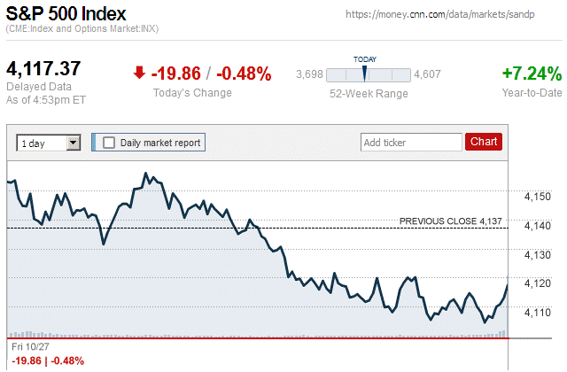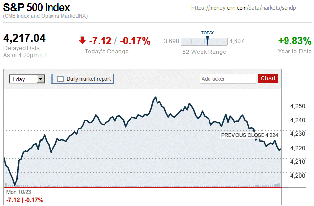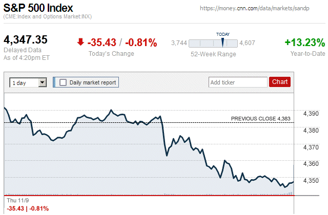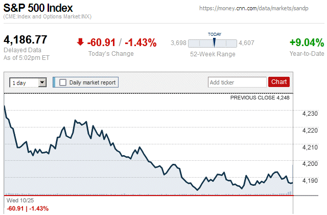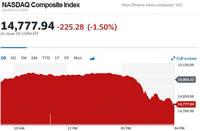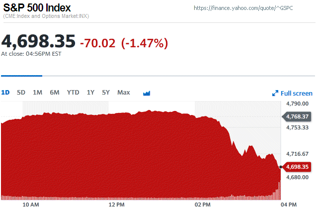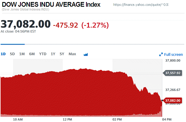 Although major stock indices were in positive for the majority of the trading day, they plummeted near the end of the day and closed with moderate to very large losses. The Dow Jones Industrial Average (DJIA) was down 1.27% to 37,082.00, while the Standard & Poor’s 500 stock index was down 1.47% to 4,698.35. The NASDAQ Composite index was down 1.50% to 14,777.94. ![]() ![]() ![]() |