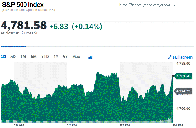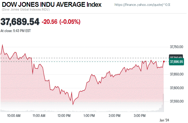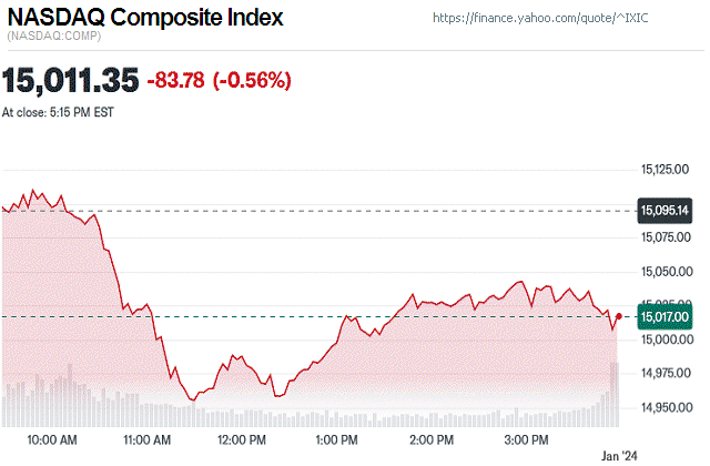 After major stock indices “zigged” and “zagged” between positive and negative territories during the trading day, they closed with very small to moderate gains. The Dow Jones Industrial Average (DJIA) was up 0.30% to 37,656.52, a record high close, while the Standard & Poor’s 500 stock index was up 0.14% to 4,781.58. The NASDAQ Composite index was up 0.16% to 15,099.18. ![]() ![]() ![]() |