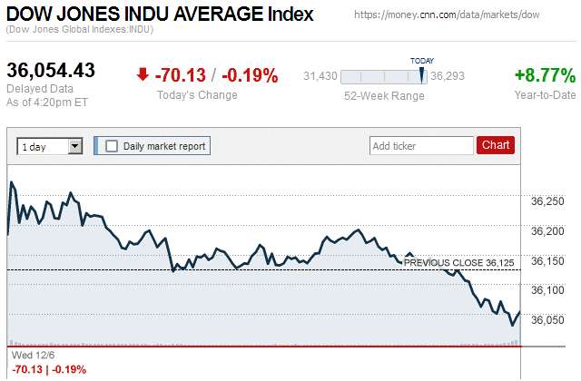 Although major stock indices began the trading day in positive territory, they declined throughout the day and closed with small to moderate losses. The Dow Jones Industrial Average (DJIA) was down 0.19% to 36,054.43, while the Standard & Poor’s 500 stock index was down 0.39% to 4,549.34. The NASDAQ Composite index was down 0.58% to 14,146.71. ![]() ![]() ![]() |