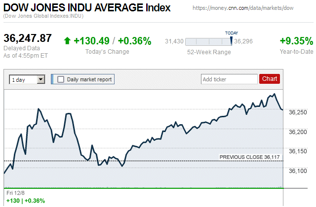 Although major stock indices began the trading day in negative territory, they spent most of the day in positive territory and closed with small to moderate gains. The Dow Jones Industrial Average (DJIA) was up 0.36% to 36,247.87, while the Standard & Poor’s 500 stock index was up 0.41% to 4,604.37. The NASDAQ Composite index was up 0.45% to 14,403.97. ![]() ![]() ![]() |