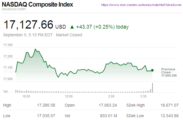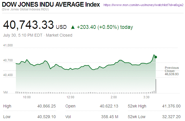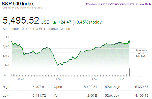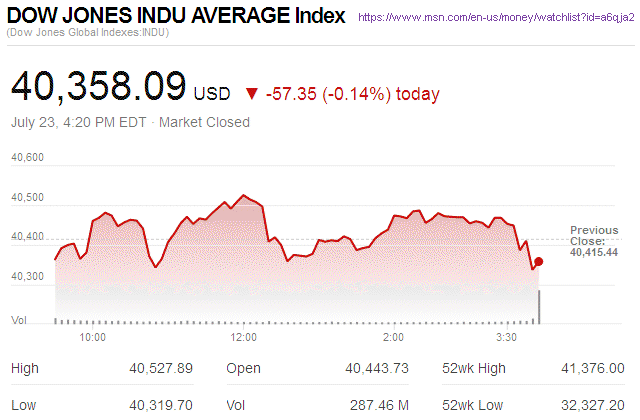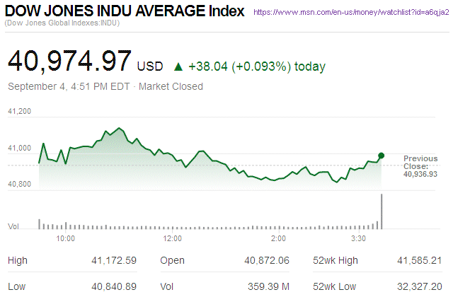 At the end of a market day of variable movements, major stock indices closed with small to moderate mixed amounts. The Dow Jones Industrial Average (DJIA) was down 0.23% to 40,736.96, while the Standard & Poor’s 500 stock index was up 0.45% to 5,495.52. The NASDAQ Composite index was up 0.84% to 17,025.88. ![]() |