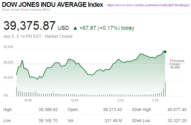 After “zigging” and “zagging” between positive and negative territories during the trading day, major stock indices closed with small to moderate gains. The Dow Jones Industrial Average (DJIA) was up 0.13% to 39,497.54, while the Standard & Poor’s 500 stock index was up 0.47% to 5,344.16. The NASDAQ Composite index was up 0.51% to 16,745.30. ![]() |