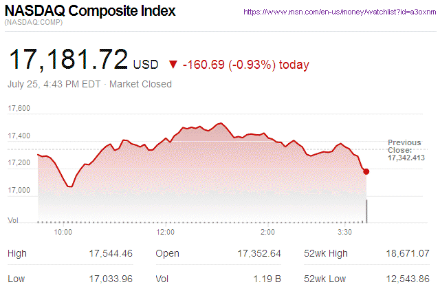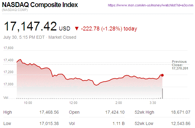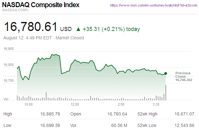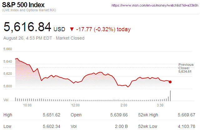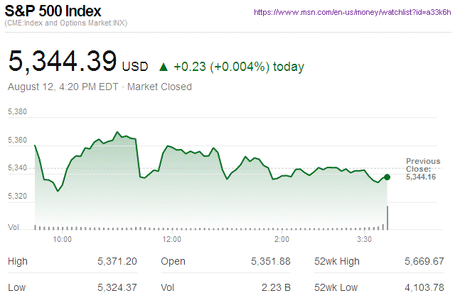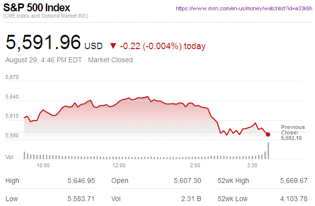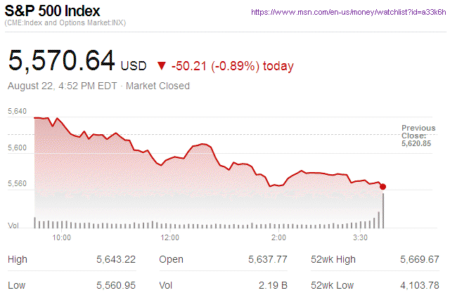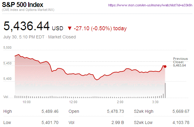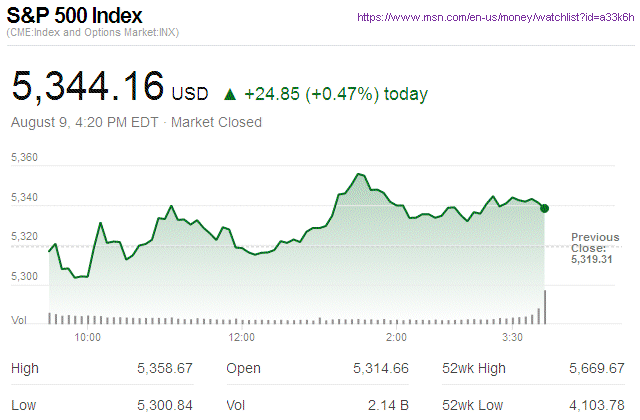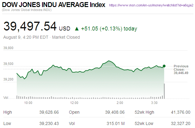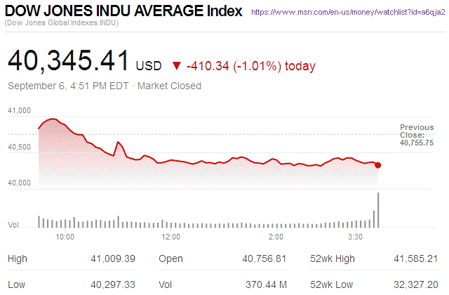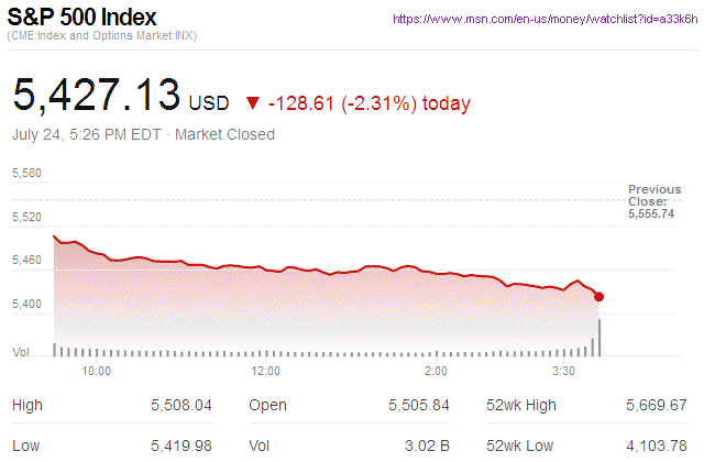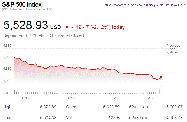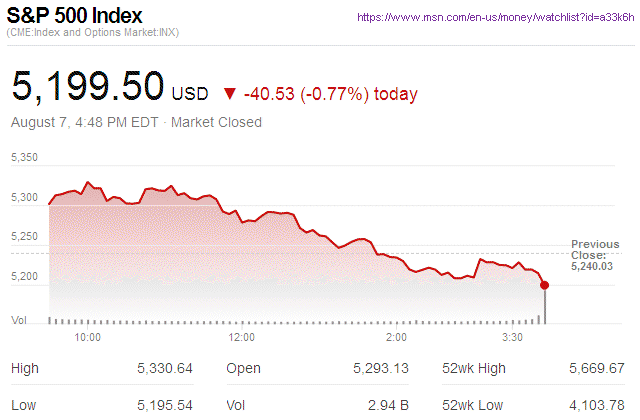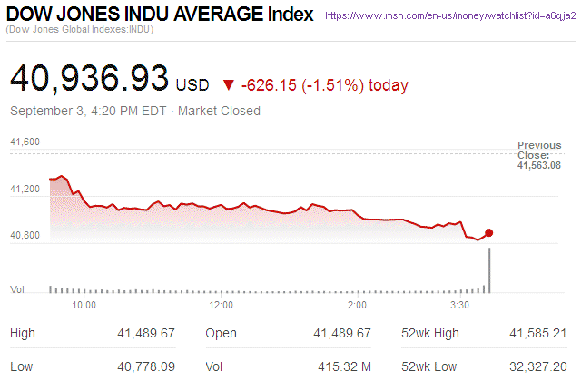 On an even greater market sell-off day than yesterday, major stock indices closed with large to very large losses. Two main reasons appear to be that jobless claims have climbed to near a one-year high, and the economy appears to be weakening too rapidly. is going berserk today The Dow Jones Industrial Average (DJIA) was down 1.51% to 39,737.26, while the Standard & Poor’s 500 stock index was down 1.84% to 5,346.56. The NASDAQ Composite index was down 2.43% to 16,776.16. ![]() |