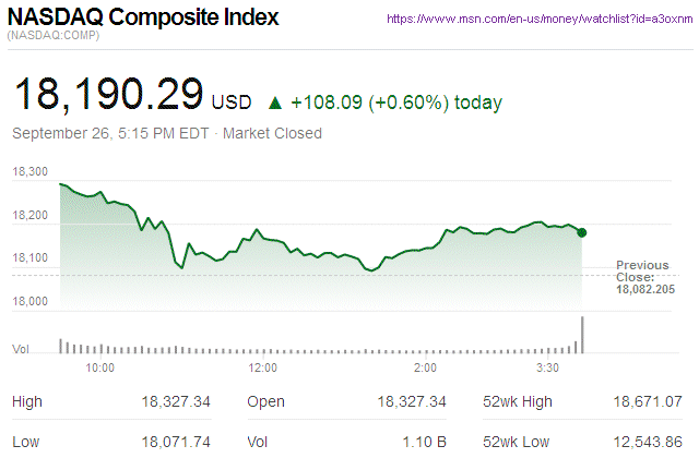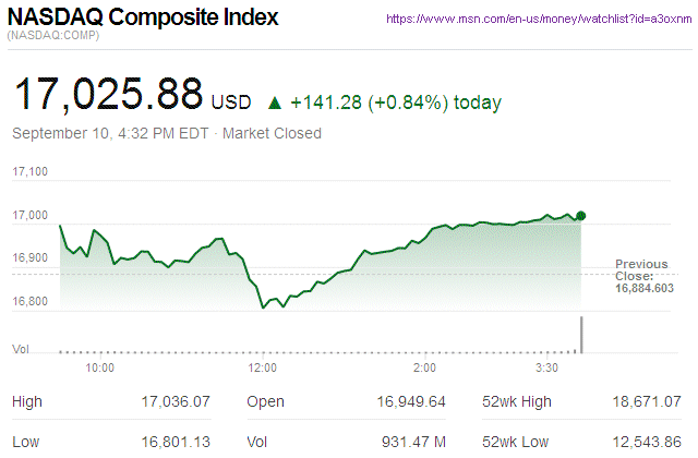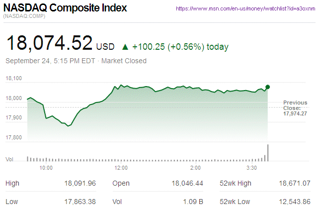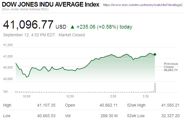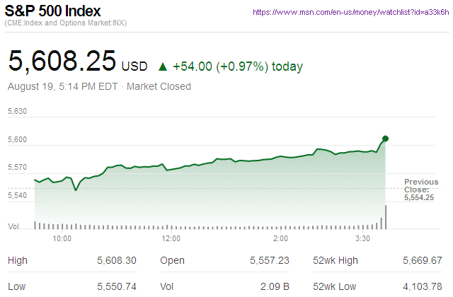 On the fifth trading day in a row of market increases, major stock indices closed with moderate to large gains. The Dow Jones Industrial Average (DJIA) was up 0.58% to 40,896.53, while the Standard & Poor’s 500 stock index was up 0.97% to 5,608.25. The NASDAQ Composite index was up 1.39% to 17,876.77. ![]() |