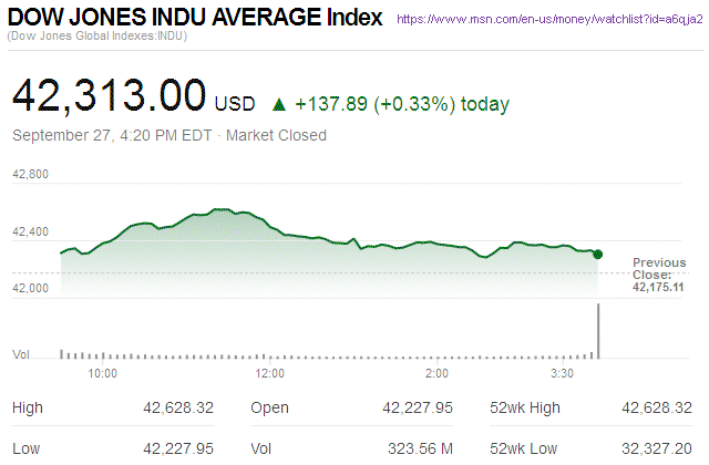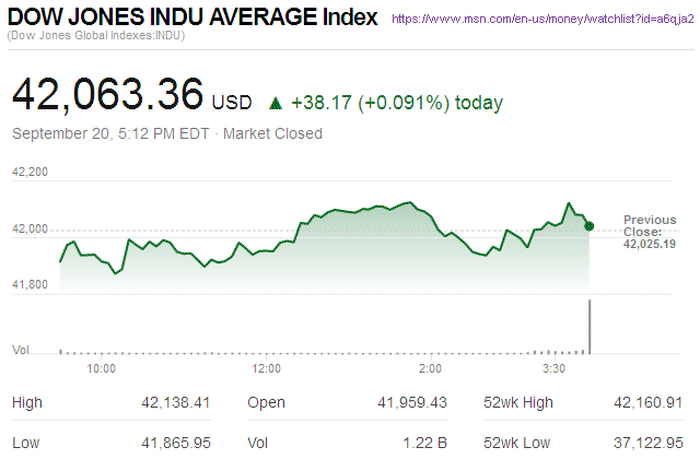 On a market day of variable movements, major stock indices closed with small to moderate mixed amounts. The Dow Jones Industrial Average (DJIA) was up 0.33% to 42,313.00, a record high close (the first close over 42,300), with a record intraday high of 42,628.32 (the first high over 42,300, 42,400, 42,500 and 42,600); while the Standard & Poor’s 500 stock index was down 0.13% to 5,738.17. The NASDAQ Composite index was down 0.39% to 18,119.59. ![]() |