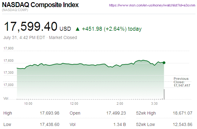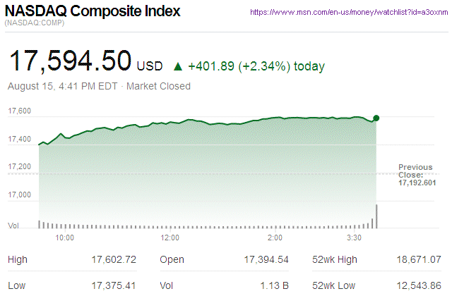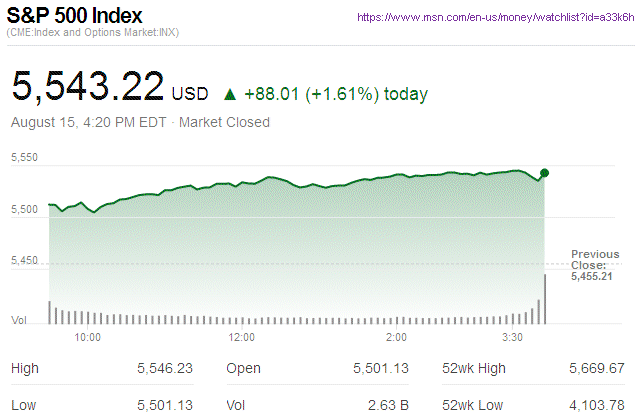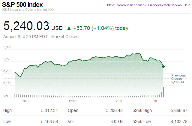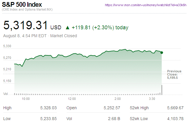 Today, in a significant compensation for yesterday’s market declines, major stock indices closed with large to very large gains. The Dow Jones Industrial Average (DJIA) was up 1.76% to 39,446.49, while the Standard & Poor’s 500 stock index was up 2.30% to 5,319.31. The NASDAQ Composite index was up 2.87% to 16,660.02. ![]() |