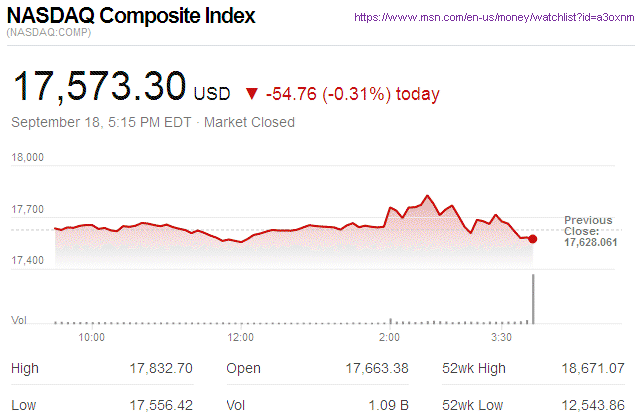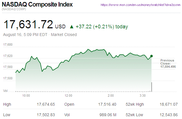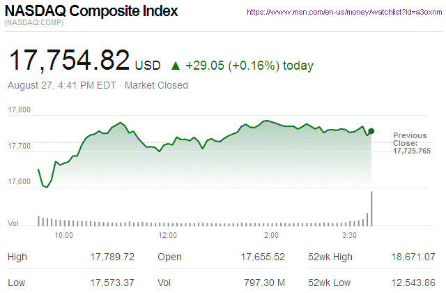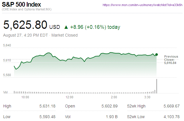 At the end of a market day of variable movements, major stock indices closed with very small to large mixed amounts. The Dow Jones Industrial Average (DJIA) was up 0.55% to 41,622.08, a record high close (the first close over 41,600); with a record intraday high of 41,733.97 (the first high over 41,600 and 41,700); while the Standard & Poor’s 500 stock index was up 0.13% to 5,633.09. The NASDAQ Composite index was down 0.52% to 17,592.13. ![]() |