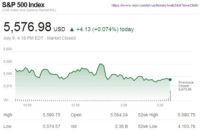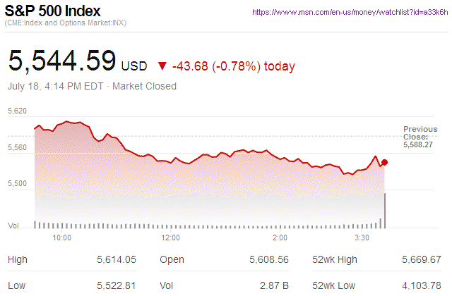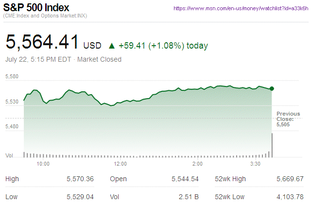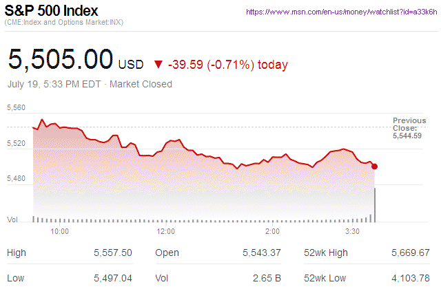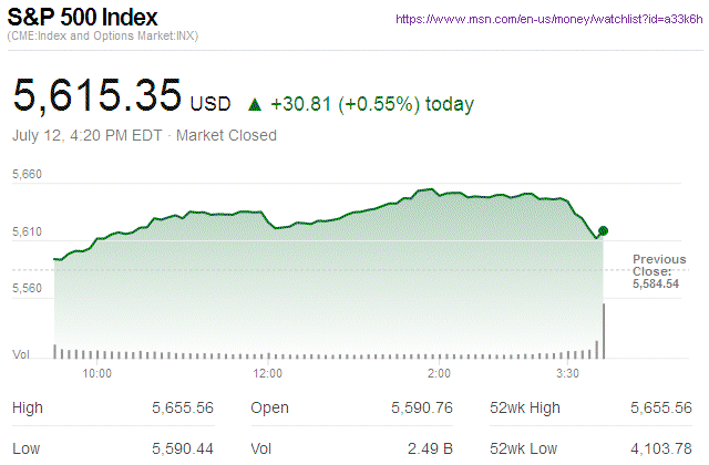 Although major stock indices began the trading day in negative territory, they gradually increased throughout the day and closed with small to moderate gains. The Dow Jones Industrial Average (DJIA) was up 0.41% to 39,331.85, while the Standard & Poor’s 500 stock index was up 0.62% to 5,509.01, a record high close (the first close over 5,500), with a record intraday high of 5,509.69. The NASDAQ Composite index was up 0.84% to 18,028.76, a record high close (the first close over 18,000). ![]() |