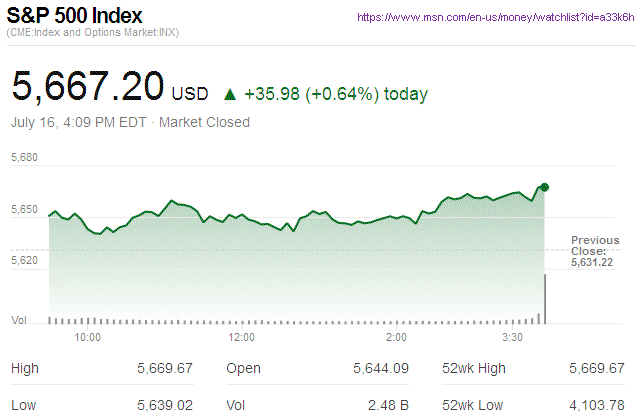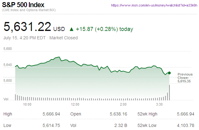 In a notable market rally, major stock indices increased throughout the trading day and closed with large to very large gains. The Dow Jones Industrial Average (DJIA) was up 1.09% to 39,721.36; while the Standard & Poor’s 500 stock index was up 1.02% to 5,633.91, a record high close (the first close over 5,600), with a record intraday high of 5,635.39. The NASDAQ Composite index was up 1.18% to 18,647.45, a record high close (the first close over 18,600), with a record intraday high of 18,655.19. ![]() |