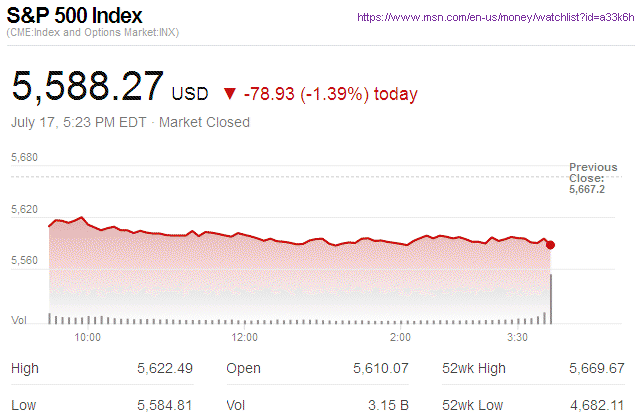 On a trading day of widespread market declines, major stock indices closed with small to moderate losses. The Dow Jones Industrial Average (DJIA) was down 0.25% to 41,503.10, while the Standard & Poor’s 500 stock index was down 0.29% to 5,618.26, with a record intraday high of 5,689.75. The NASDAQ Composite index was down 0.31% to 17,573.30. ![]() |